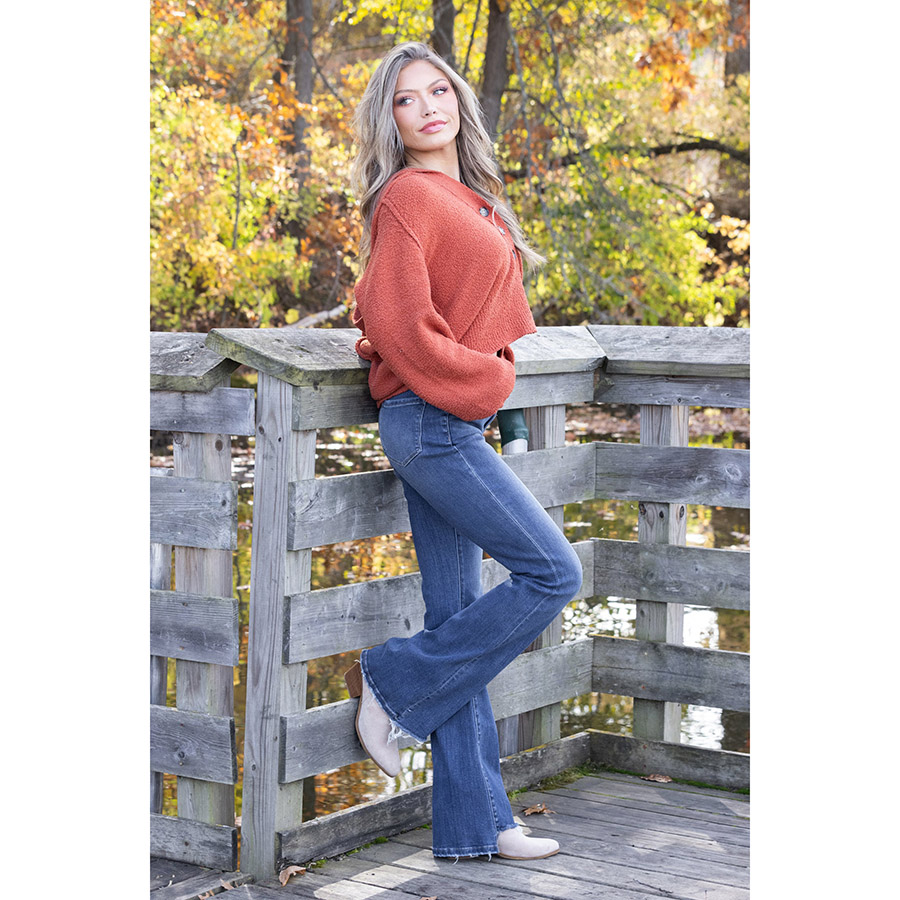 Made with comfort stretch denim, these jeans feature a high rise waist that flatters your figure and a raw slant hem for a unique touch. These jeans are full length to elongate your legs and feature a flared silhouette for a trendy look.